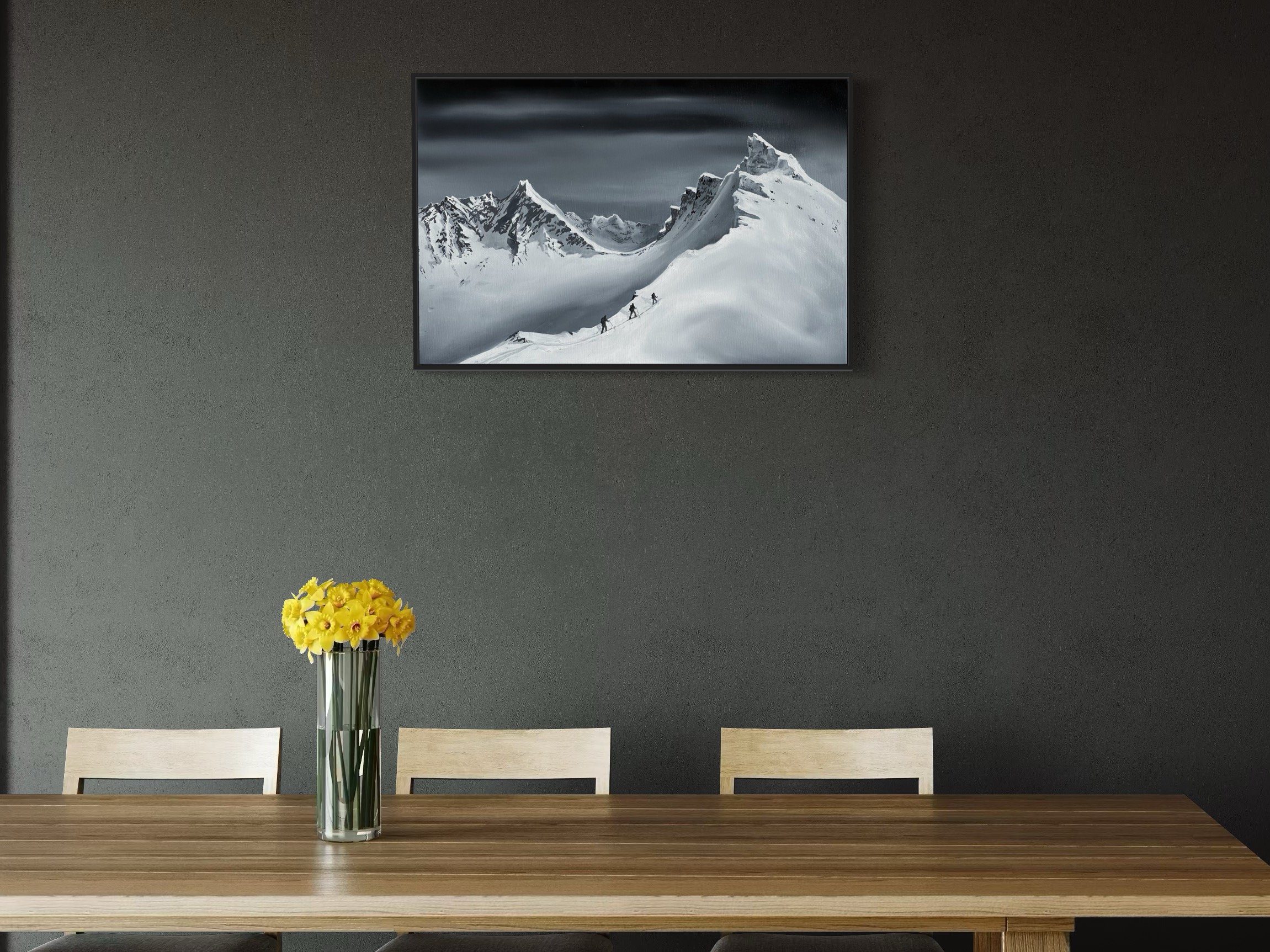 Hvert oljemaleri er unikt, malt i en moderne sort-hvit kontrast med subtile nyanser av Payne’s Grey som tilfører liv og bevegelse til motivet. Oljemalingen gir en naturlig dybde og tekstur som fanger lyset på en måte kun dette mediet kan – og skaper et ektefølt og stemningsfullt uttrykk.