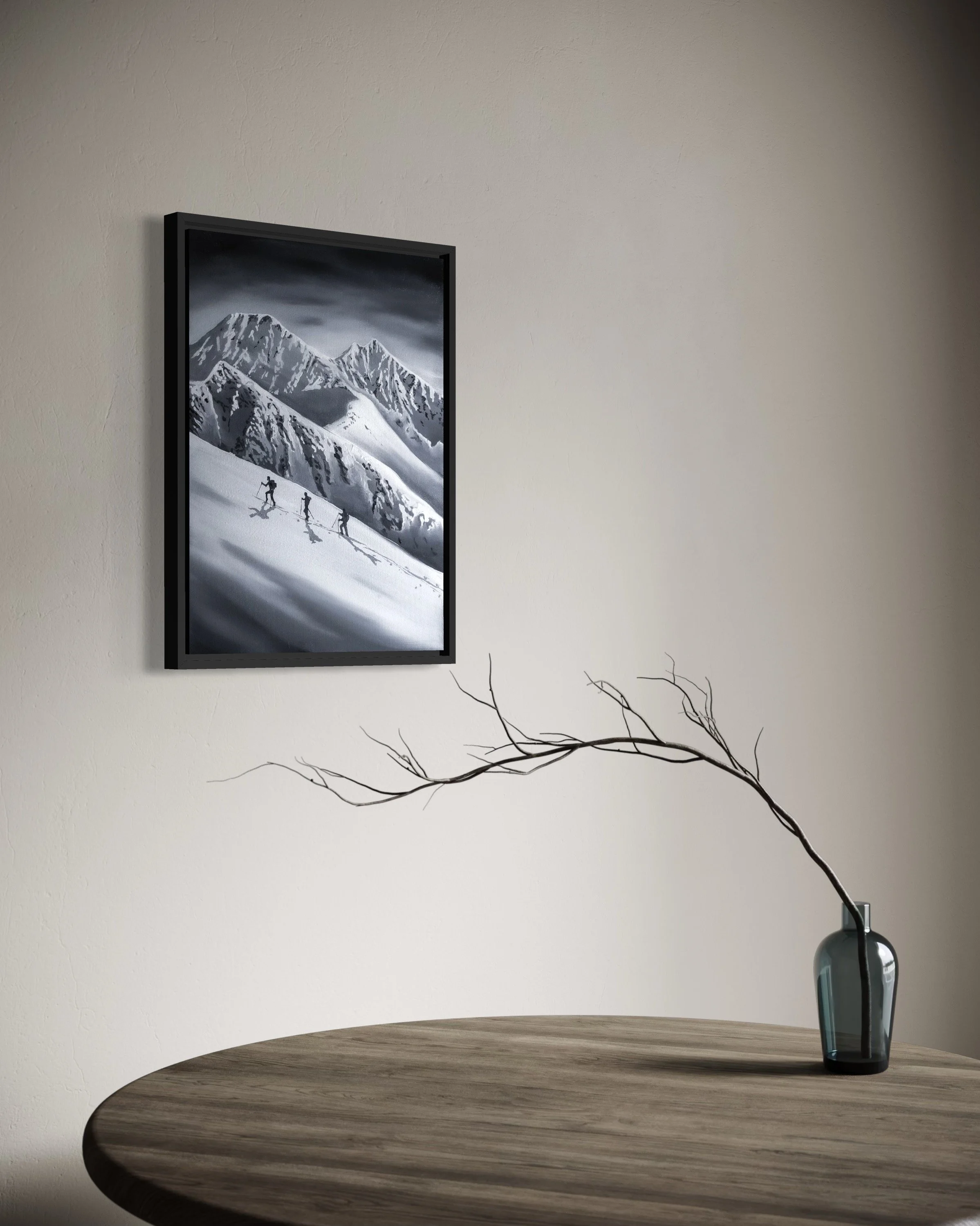 Hvert oljemaleri er unikt, malt i en moderne sort-hvit kontrast med subtile nyanser av Payne’s Grey som tilfører liv og bevegelse til motivet. Oljemalingen gir en naturlig dybde og tekstur som fanger lyset på en måte kun dette mediet kan – og skaper et ektefølt og stemningsfullt uttrykk.
