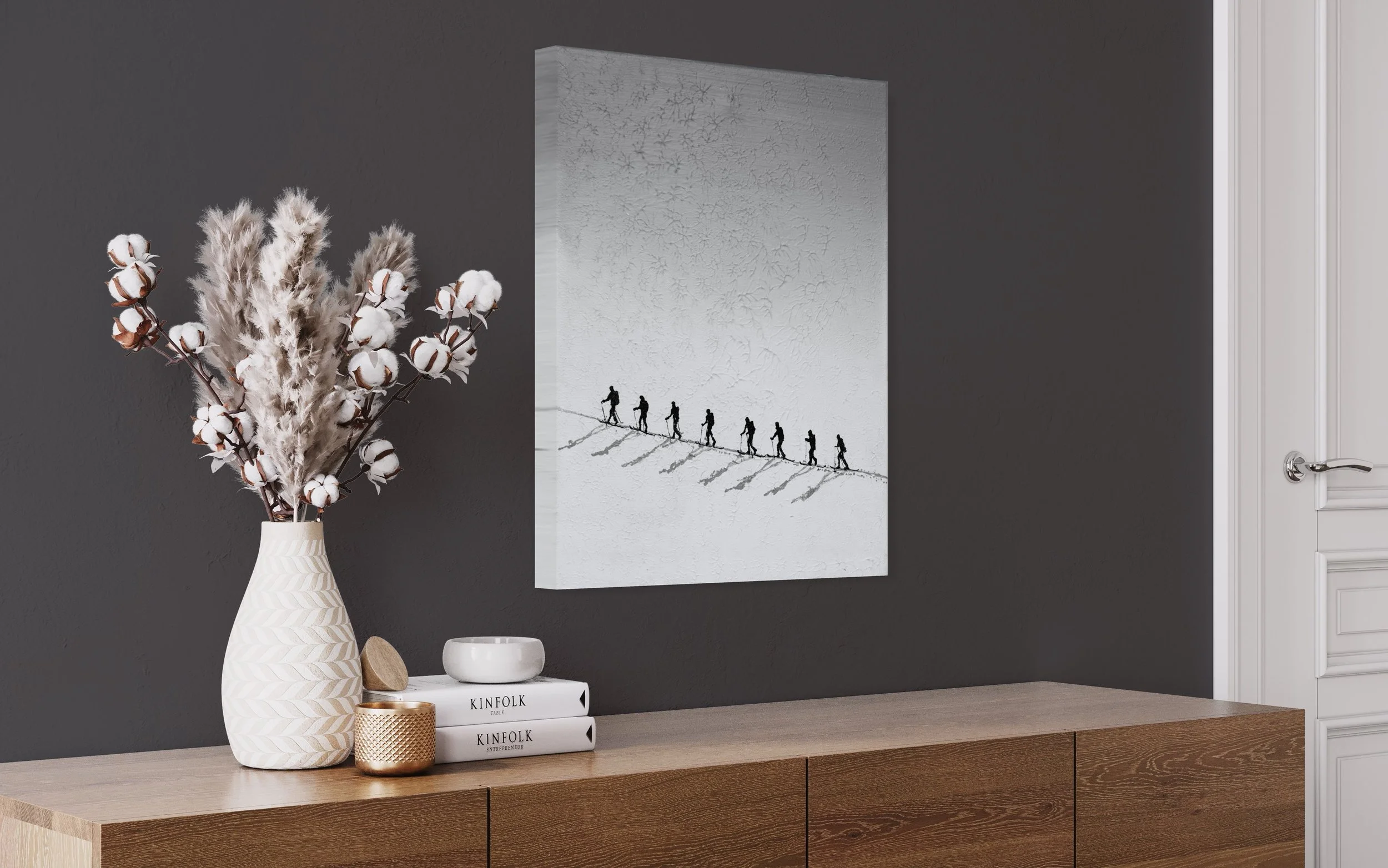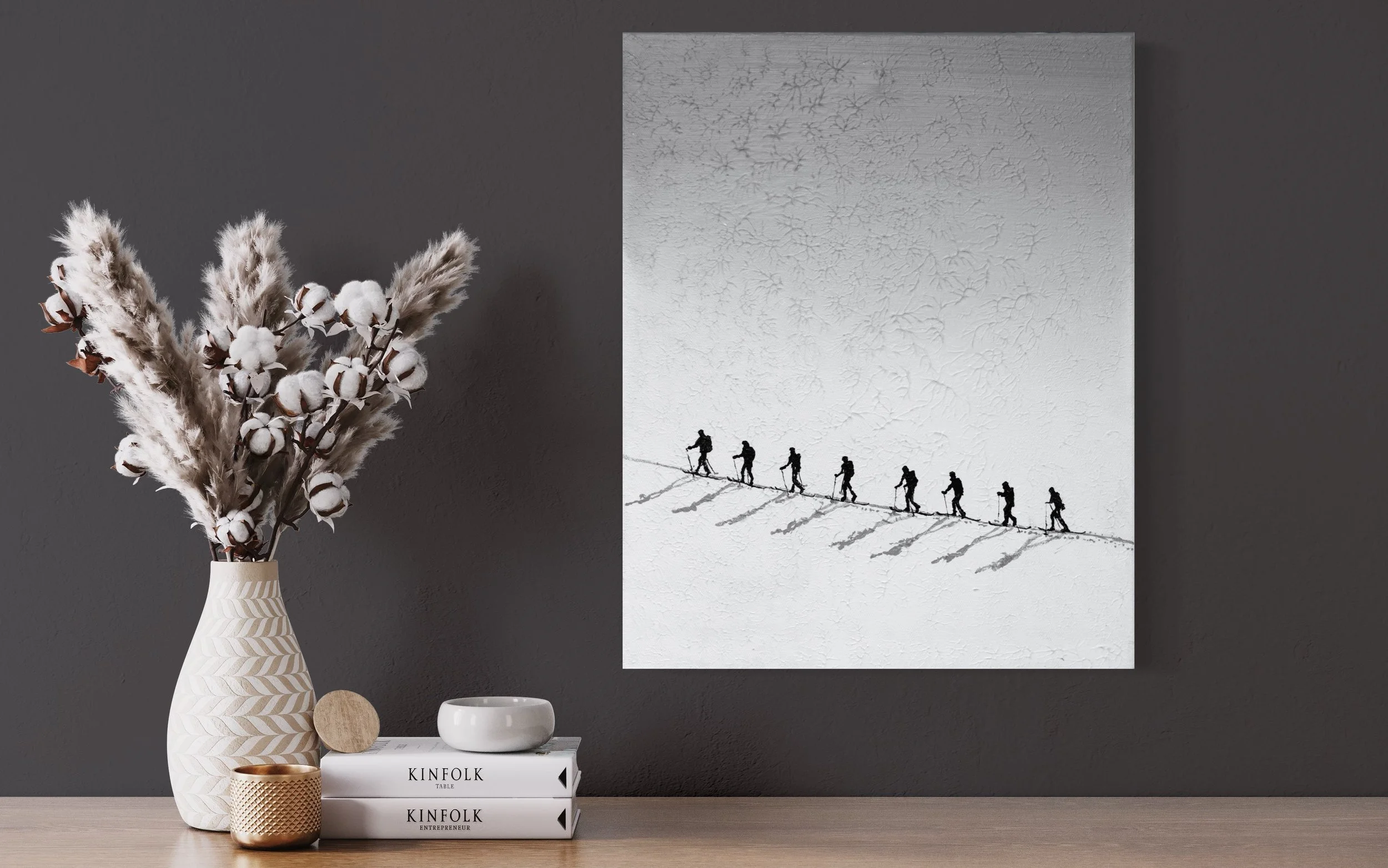 Laussnøjakt er er malt med inspirasjon fra magiske hvite dager på topptur i Sogn og fjordane. Maleriet er malt i akrylmaling, med store kontraster i en moderne svart-hvit stil.